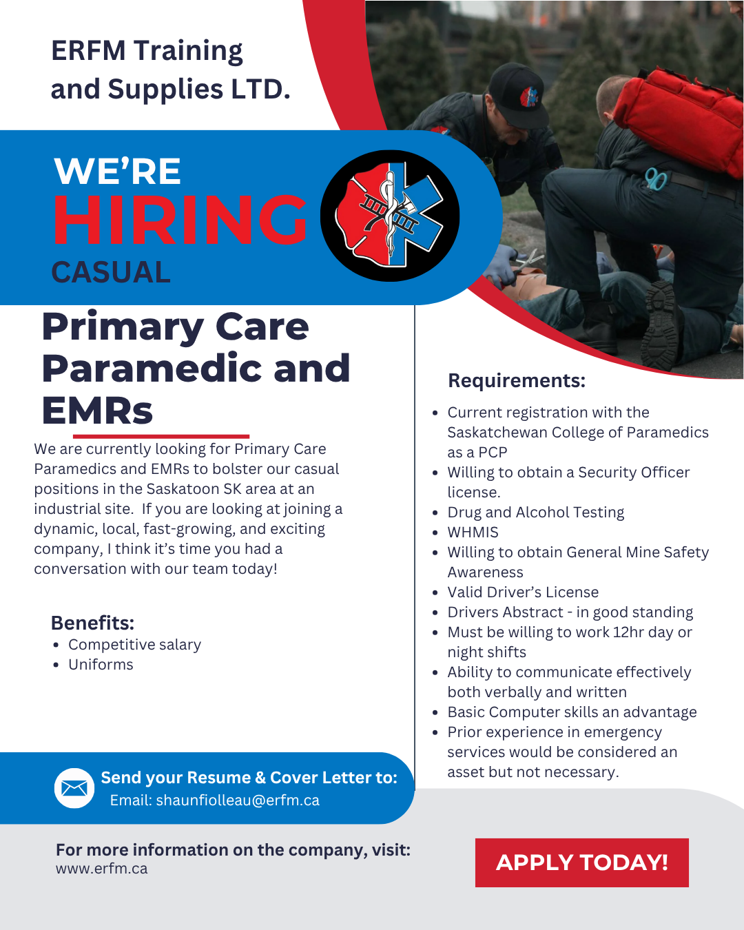 The Saskatchewan College of Paramedics does not charge for posting of employment opportunities and does not vet the submissions. Please direct all inquiries to the employing agency. When applying in other jurisdictions, remember to follow local regulations.
